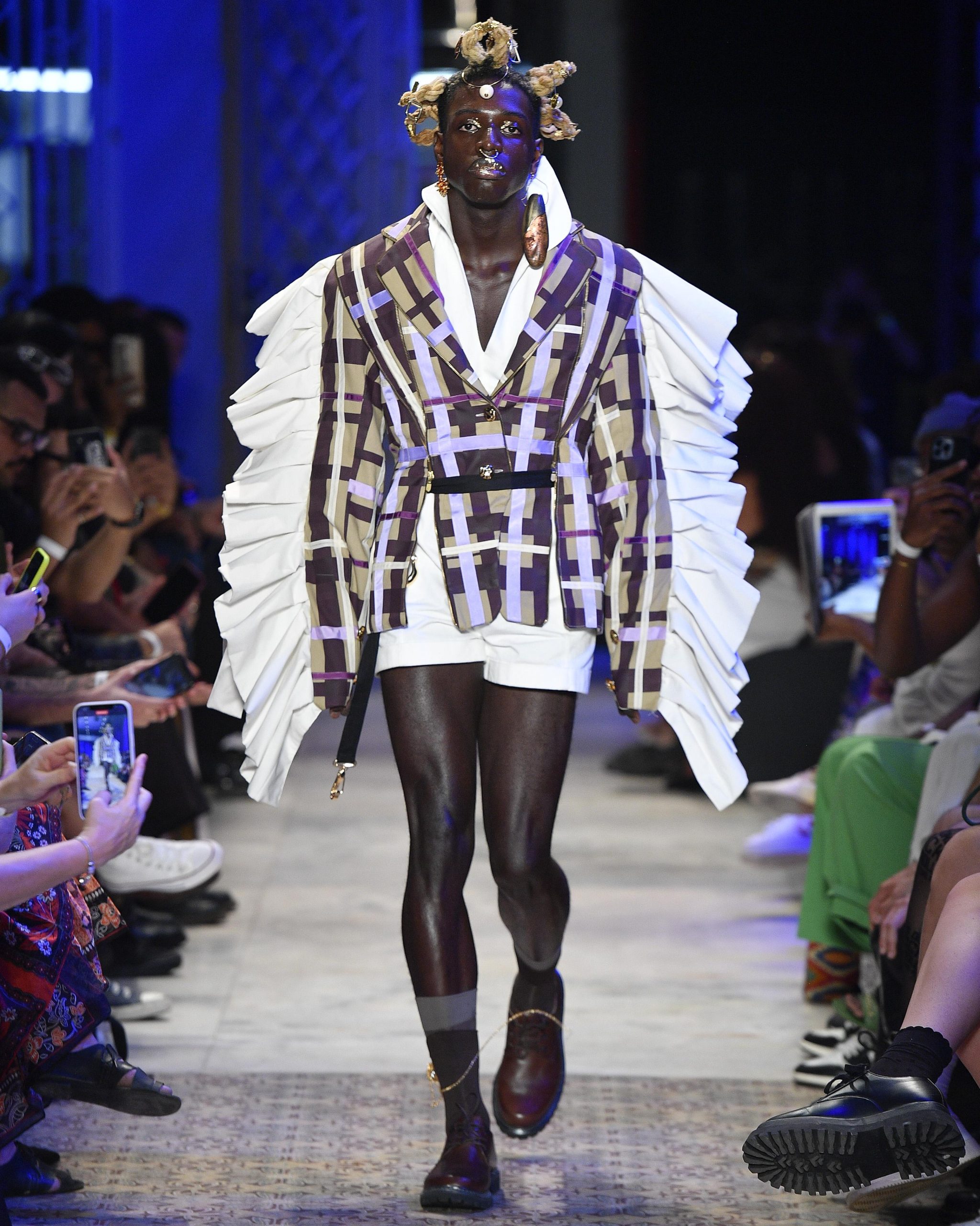 Christian Sato ficou em terceiro lugar com seu patchwork e estampas de pespontos, enquanto Wender Neves abocanhou o segundo lugar com seus volumes e técnicas de superfície em tons terrosos. Já o prêmio principal foi para Guilherme Dutra, que uniu discurso e beleza em uma só coleção. Em suas pesquisas, o estilista descobriu que o xadrez é, na verdade, de origem africana. Por muitos anos, a padronagem foi associada à uma estética eurocentrada, mas, nesta coleção, a ideia é voltar às raízes. Nessa busca por uma nova identidade que misture referências africanas com o que já conhecemos do xadrez, o designer lança mão de volumes extremos na lateral de blazers, mangas bufantes e toda uma sorte de distorções de silhueta que caem muito bem acompanhadas de sua alfaiataria.